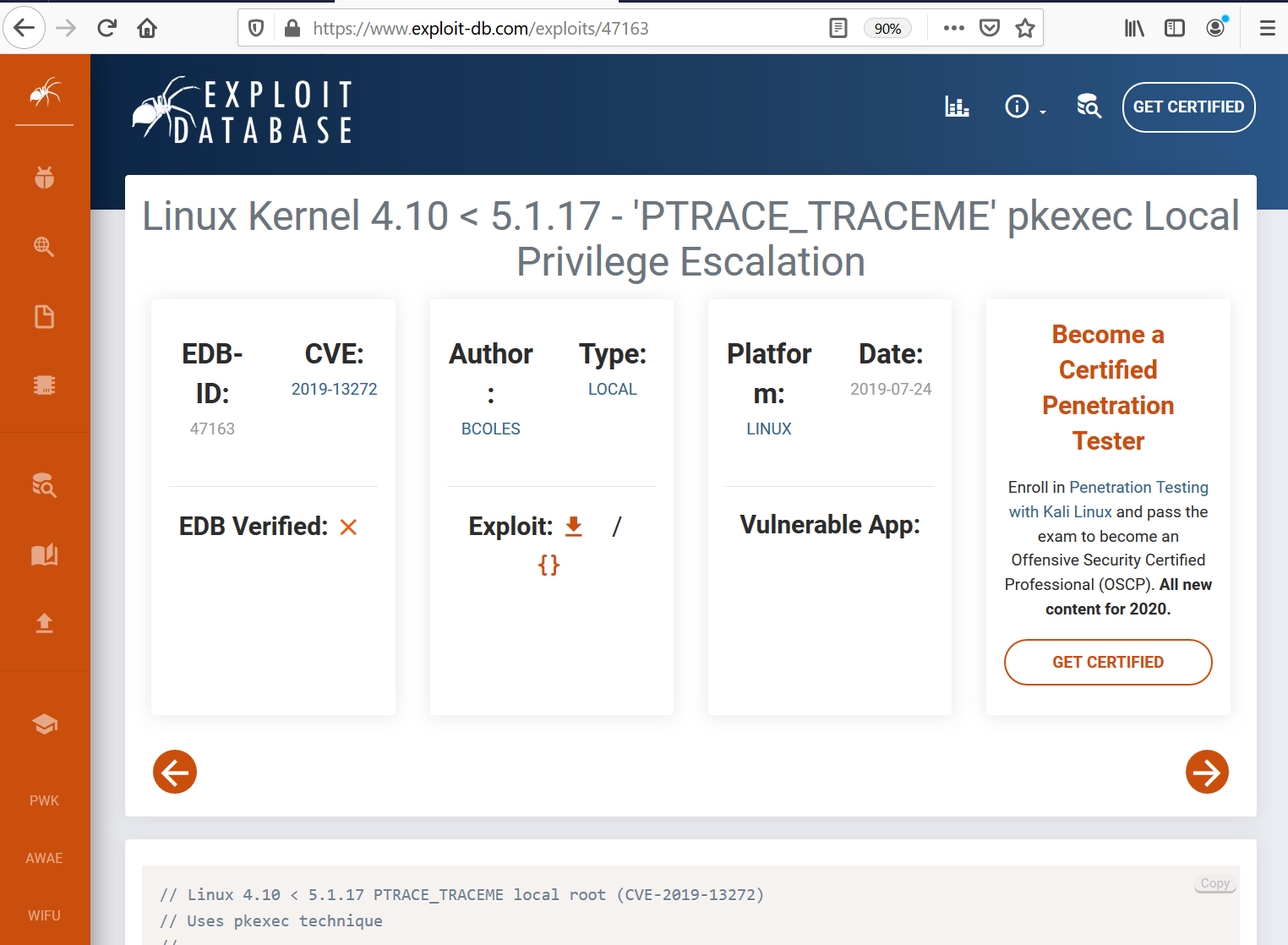 In the previous step, we have enumerated the older version of the kernel. Next, I quickly searched for a local exploit for the identified kernel version and found an exploit on the Exploit-DB website: