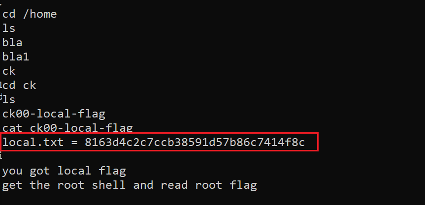 In the above screenshot, we can see that we have got the local user flag, but our target is to get the root access. This message is also displayed on the screen when we read the flag file.