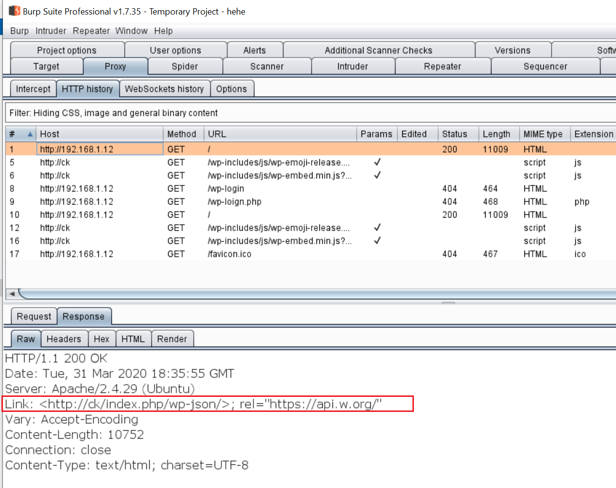 The WordPress website is running on the target machine but there was some problem in the website design. I set up Burp Suite to identify the issue and see the complete site: