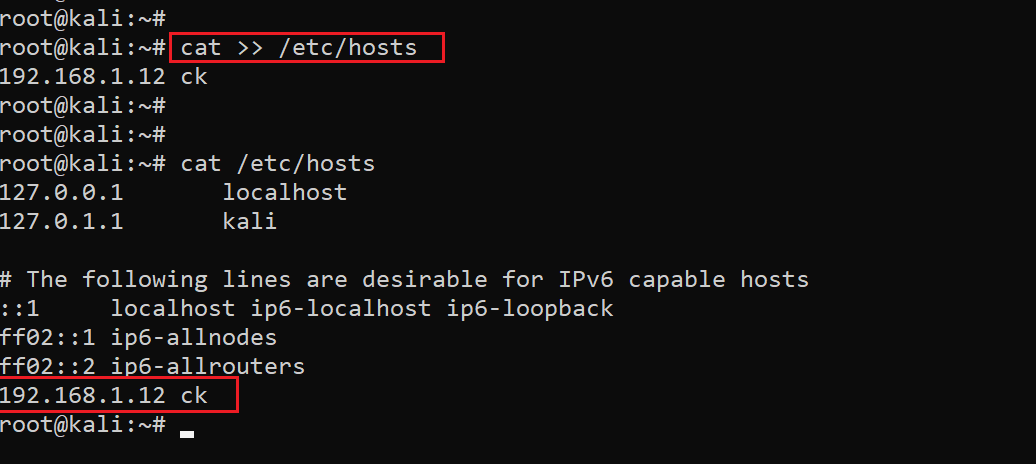 Command used: cat >> /etc/hosts
