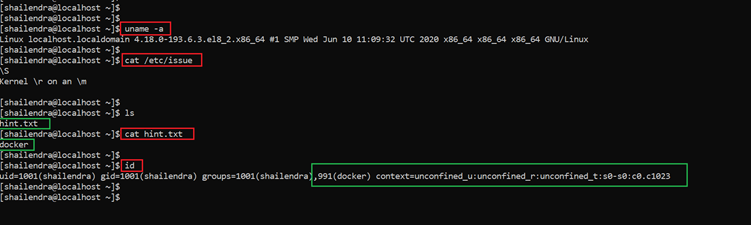 As we can see above, the file name was ”hint.txt” and when we opened it, there was only one word mentioned: “docker”. This could mean that Docker is being used on the target machine and this may lead us to getting the root access.