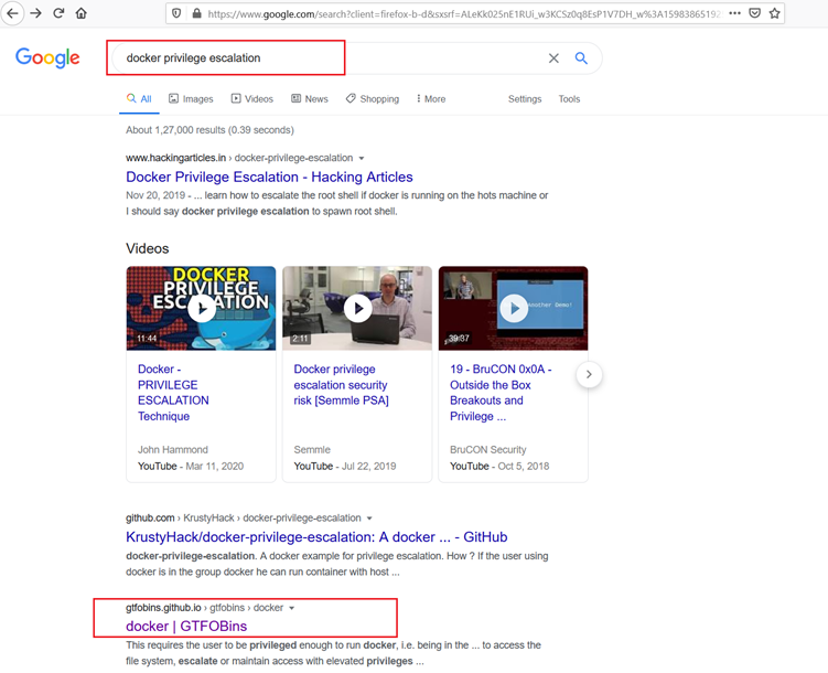 From the previous step, we know that Docker is the key to move forward, so we started searching the web for Docker privilege escalation vulnerabilities to help us get the root. This can be seen in the following screenshot: