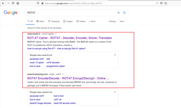 In the highlighted area of the above screenshot, we can see that these credentials are in encrypted form. Let’s try decrypting the above with rot47 cipher decryption. For this, we chose an online rot47 decryptor tool, as there are many available on Google. The decrypted results can be seen below: