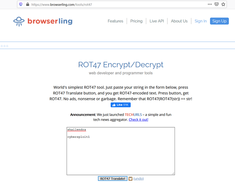 ROT47 Encrypt/Decrypt, browserling