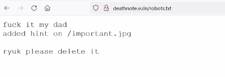 We found another hint in the robots.txt file. The hint mentions an image file that has been mistakenly added to the target application. So, let us open the file 'important.jpg' on the browser.