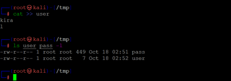 We created two files on our attacker machine. We added all the passwords in the 'pass' file. We have enumerated two usernames on the target machine, 'l' and 'kira.' We have added these in the 'user' file. In the next step, we will be running Hydra for brute force.