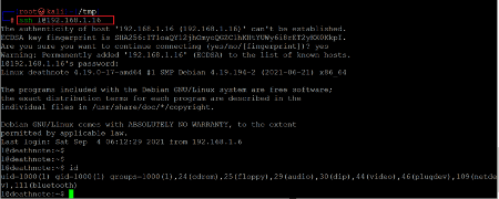 The login was successful as the credentials were correct for the SSH login. We are now logged into the target machine as user 'l.' We ran the id command output shows that we are not the root user. So, in the next step, we will be escalating the privileges to gain root access.
