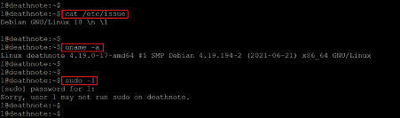 After getting the version information of the installed operating system and kernel, we searched the web for an available exploit, but none could be found. So, we used the 'sudo –l' command to check the sudo permissions for the current user. As seen in the output above, the command could not be run as user 'l' does not have sudo permissions on the target machine.
