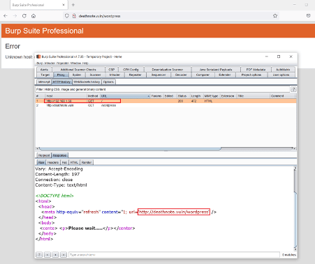 When we opened the target machine IP address into the browser, the website could not be loaded correctly. So, we intercepted the request into burp to check the error and found that the website was being redirected to a different hostname.