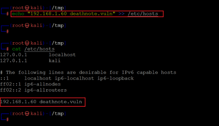 Command used: << echo “192.168.1.60 deathnote.vuln” >> /etc/hosts >>