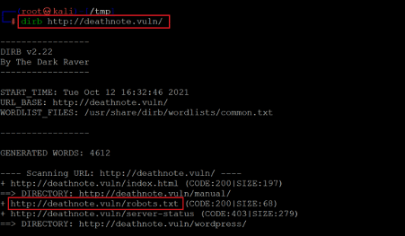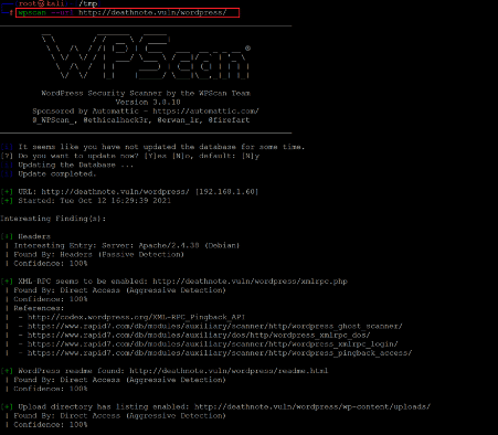 Command used: << wpscan --url http://deathnote.vuln/wordpress/ >>