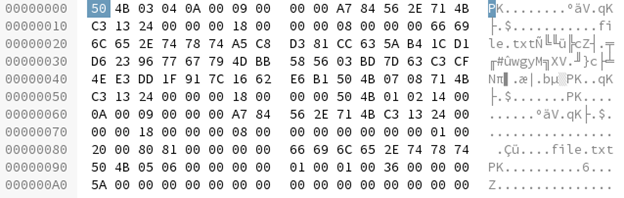 Next, we locate the hex pattern '50 4B' (PK header) in the hex dump and copy these and all of the following bytes into a new file.