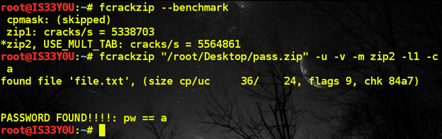 fcrackzip "/root/Desktop/pass.zip" -u -v -m zip2 -l1 -c a