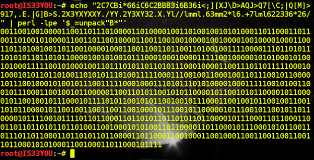 This binary sequence immediately stands out from the rest of the 'garbage' ASCII dump. Consequently, we convert this binary sequence to ASCII and we get the password. For this, we use Perl's pack function to derive ASCII text corresponding to the binary sequence [Figure 5]: