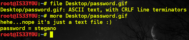 Notice that the image does not open in the browser. This is our first clue that it is not a GIF image as advertized. We download this file on our local machine and analyze the file using the Linux 'file' utility that reads Magic Numbers in the file to determine the file type. In our case, we notice that this file contains ASCII text, and so we use the 'more' command to print its content on the screen, which reveals the password [Figure 2].