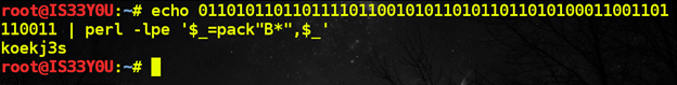 As in a previous challenge, we use Perl to pack this into corresponding ASCII text and obtain the password [Figure 18]: