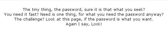 This challenge is a little different in that it presents us with something that seems more like a riddle rather than a file [Figure 7]. However, bear in mind that this is a steganography challenge and so the password must be hidden in plain sight within these words. You could try all words as possible passwords, but such mindless brute forcing would be cheating and no fun. We need to discover the logic in the challenge. If you look closely, the words in the text are rather oddly placed. This provokes us to either re-arrange the words until a pattern emerges, or to simply skip certain words. We notice the title which states 'words' 3 times. If we start from 'The', at the beginning, and read the text skipping 3 words, we get: "The password that You Need for the challenge page is Again."