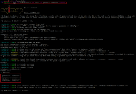 The available columns are 'username' and 'password.' We selected and used the '--dump' option to download the complete database information. The command used for this purpose and the results can be seen highlighted below.
