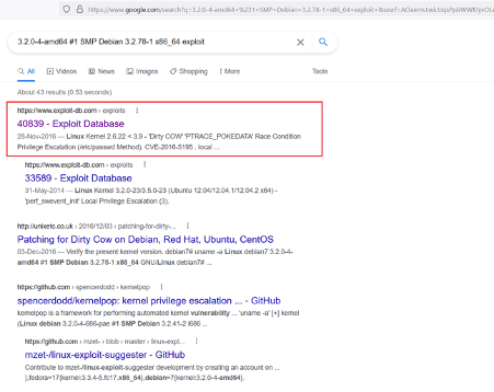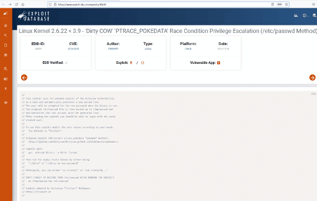 The user flag 'user.txt' can be seen in the above screenshot. As we need to escalate user privileges to root to complete the CTF challenge. We enumerated the operating system and kernel information on the target machine. The version information for the operating system and kernel can be seen in the above screenshot. We researched over the internet to identify known vulnerabilities in the installed versions. We identified a privilege escalation vulnerability in the installed operating system. The exploit was also publicly available on the exploit-DB website, which is seen below.