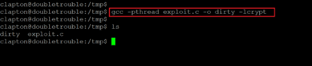 Command used: << gcc -pthread exploit.c -o dirty -lcrypt >>