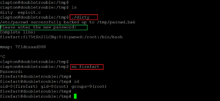After the compilation process, two files were generated in the 'tmp' directory. As per the description provided on the exploit website, we need to execute the file named 'dirty' and provide the new password for the root user. The default name of the root privilege account is 'firefart'.