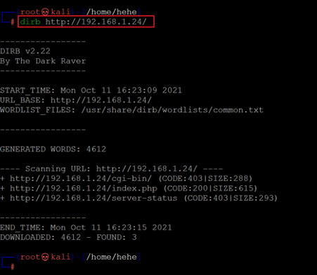 We tried a few default username and password combinations, but none worked on the login page. So, we decided to conduct a web application file and folder enumeration scan on the target application. We used the Dirb tool for the file enumeration scan. The command used and the results can be seen in the following screenshot.