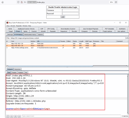 The Dirb scan could not identify any useful files which could be explored further. For further analyzing the target application, we opened a burp proxy. We intercepted the login page request for analysis which can be seen below.