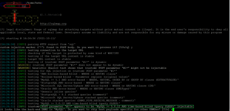 The request was saved as 'sql' file on our attacker machine. We edited the request by using the vim command and added the '*' character in the vulnerable name parameter. (There are other ways also to run SQLMap on the Post request. However, this is one of the easiest ways to run SQLMap on Post request) We again used the cat command to verify the changes in the file. Let us launch SQL injection attacks on the request, as seen in the following screenshot.