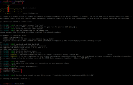 We used the SQLMap command to exploit the SQL injection vulnerability. The tool confirms that the name parameter is vulnerable to SQL injection. We used the –dbs option with the sqlmap command to check for available databases, which is highlighted in the following screenshot.