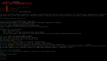 Command used: << sqlmap -u sql doubletruble –tables >>