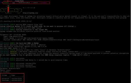 Command Used: << sqlmap -r sql -D doubletrouble -T users --columns >>
