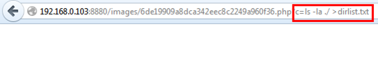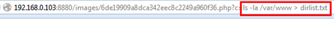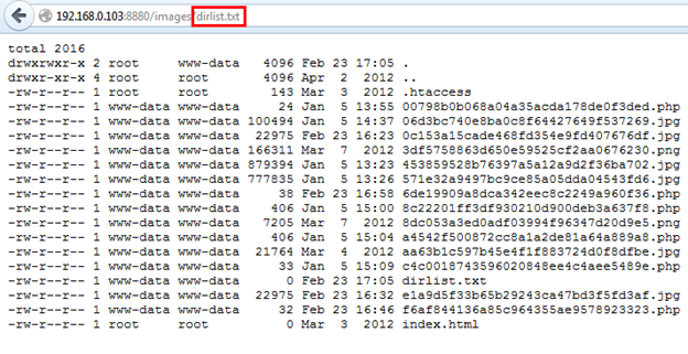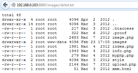 After executing the command we know that the result is in the dirlist.txt file so let's open the dirlist.txt file from images directory, which is: http://192.168.0.103/images/dirlist.txt