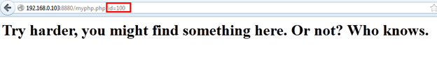 After spidering the application, we now have some internal URLs for the application. We can see some PHP files over there. The upload.php file is used for file upload functionality, but what is that myphp.php file? Let's find out what is hidden in that page. Open the URL in the browser and add an id parameter with some integer value. For example, we added id=100 and the URL looks like this: http://192.168.0.103:8880/myphp?id=100