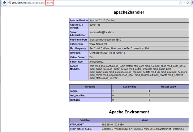 Now this time we have some juicy information; the full PHP configuration is disclosed. We can see all PHP functions that are disabled from configuration file. Again we changed the id value to 108.