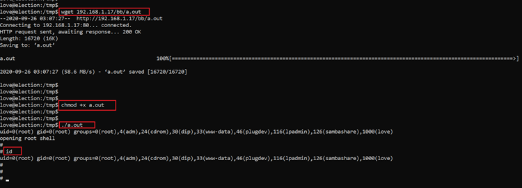 Now in the target machine in which we had the user access, we again used wget utility to download the a.out file in the target system. After downloading it, we give the executable permission by using the chmod command. Then we run the exploit, which gives the root access. We verified it by using the ID command.