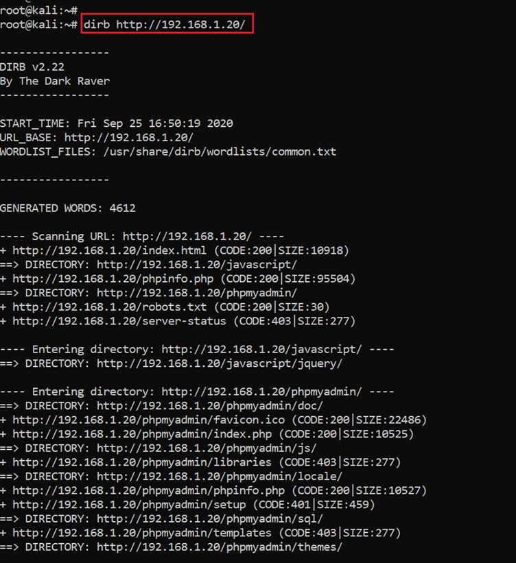 As we can see above, the Apache default page is showing on the target machine, which means we have to identify the hidden directories. This can be done through the dirb utility, which is available in Kali Linux.