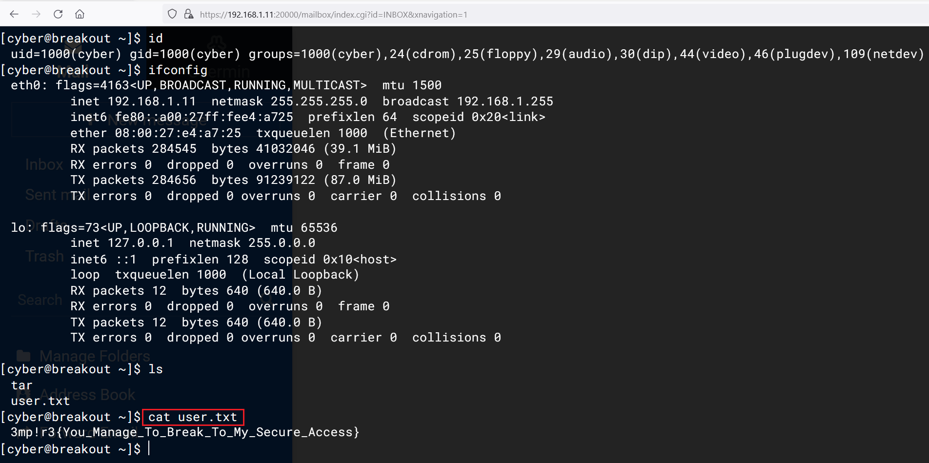 We ran the 'id' command to check the user information. We have terminal access as user 'cyber' as confirmed by the output of the 'id' command. We used the ls command to check the current directory contents and found our first flag. The flag file named 'user.txt' is given in the previous image. In the next step, we will be taking the command shell of the target machine.