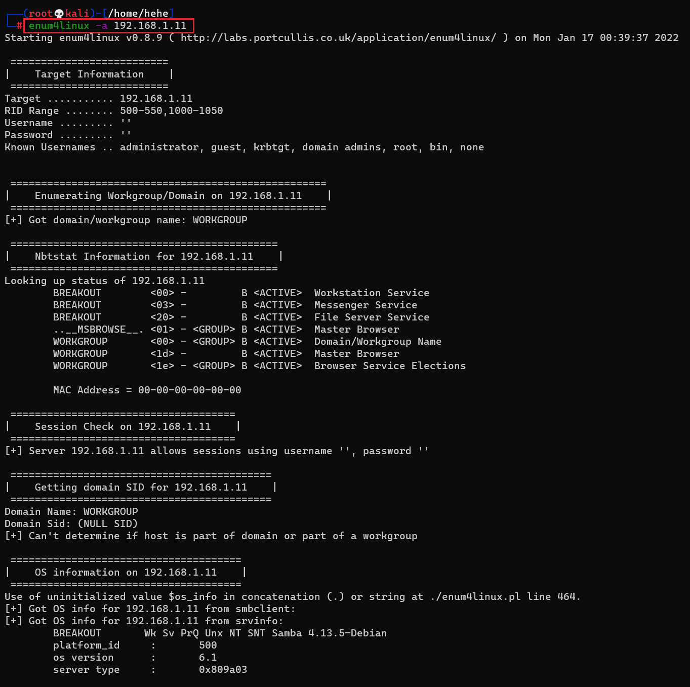 Command used: << enum4linux -a 192.168.1.11 >>