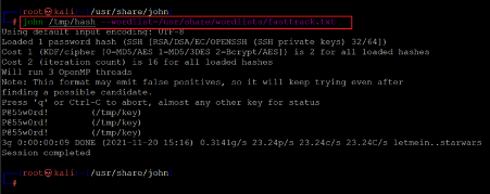 Command used: << .ssh2john.py /tmp/key > /tmp/hash >>