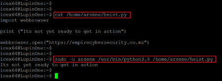 - << sudo -u arsene /usr/bin/python3.9 /home/arsene/heist.py >>