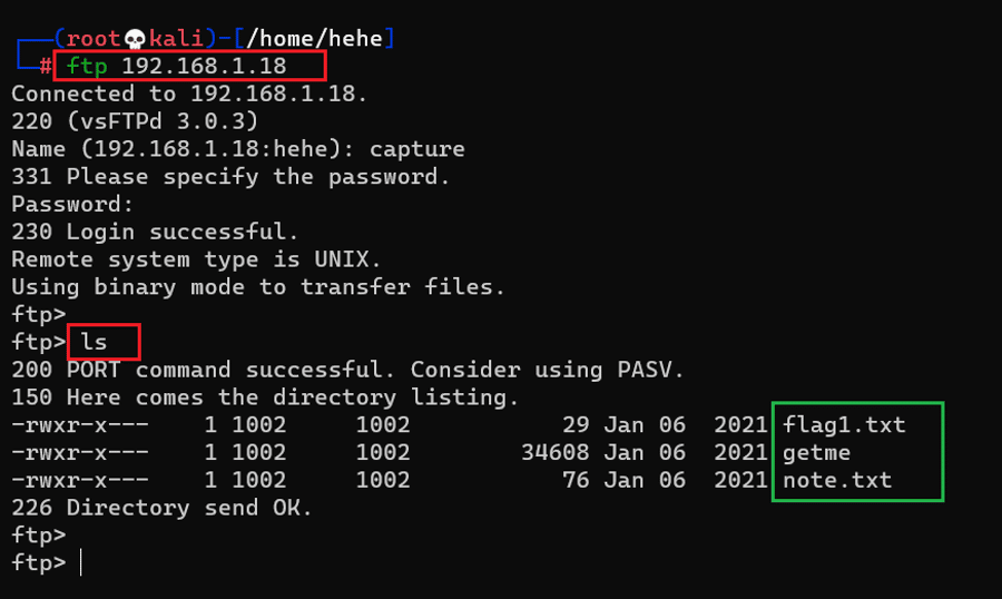 The FTP and SSH ports have been identified as open during the port scan so let us use the above credentials on these ports. First, we used these credentials on the SSH port, but it did not work. When we used these credentials on the FTP port, the login was successful.