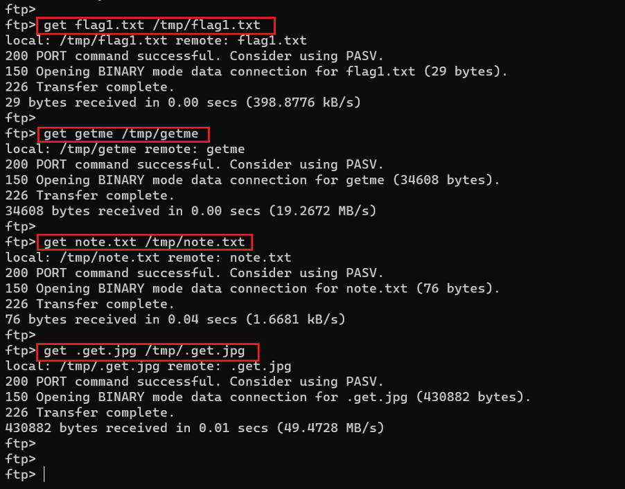 As we can see, we have logged into the target machine through the FTP service. After logging in, we used the 'ls' command to check the current directory contents. We found four files in the current directory. Let us download these files on our attacker machine for further analysis.