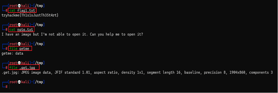 We used the cat command to read all the files. We found the first flag named 'flag1.txt', which can be seen in the above screenshot. The second file had a hint message stating an image file that should be opened for further clues. Then we used the file command to see the file type. The output of the file command shows that it is an image file.
