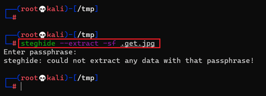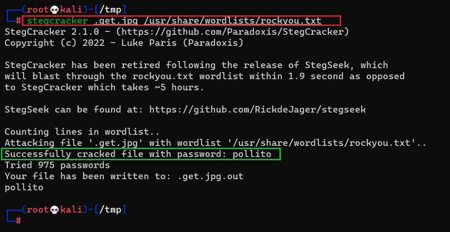 Command used: << stegcracker .get.jpg /usr/share/wordlists/rockyou.txt >>