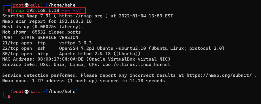 In the Nmap Command, we used '-sV' option for version enumeration to identify the details about the running services. We used the '-p-'to start a full port scan, it guides Nmap to conduct the scan on all available 65535 ports. By default, Nmap conducts the scan only on known 1024 ports. So, it is very important to conduct the full port scan during the Pentest or solve a CTF exercise to generate maximum results.